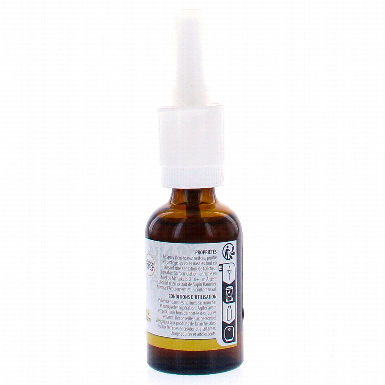 Ce spray est un spray nasal bio au miel de manuka 16+ et à l’argent colloïdal 20PPM pour nettoyer et purifier les voies nasales.