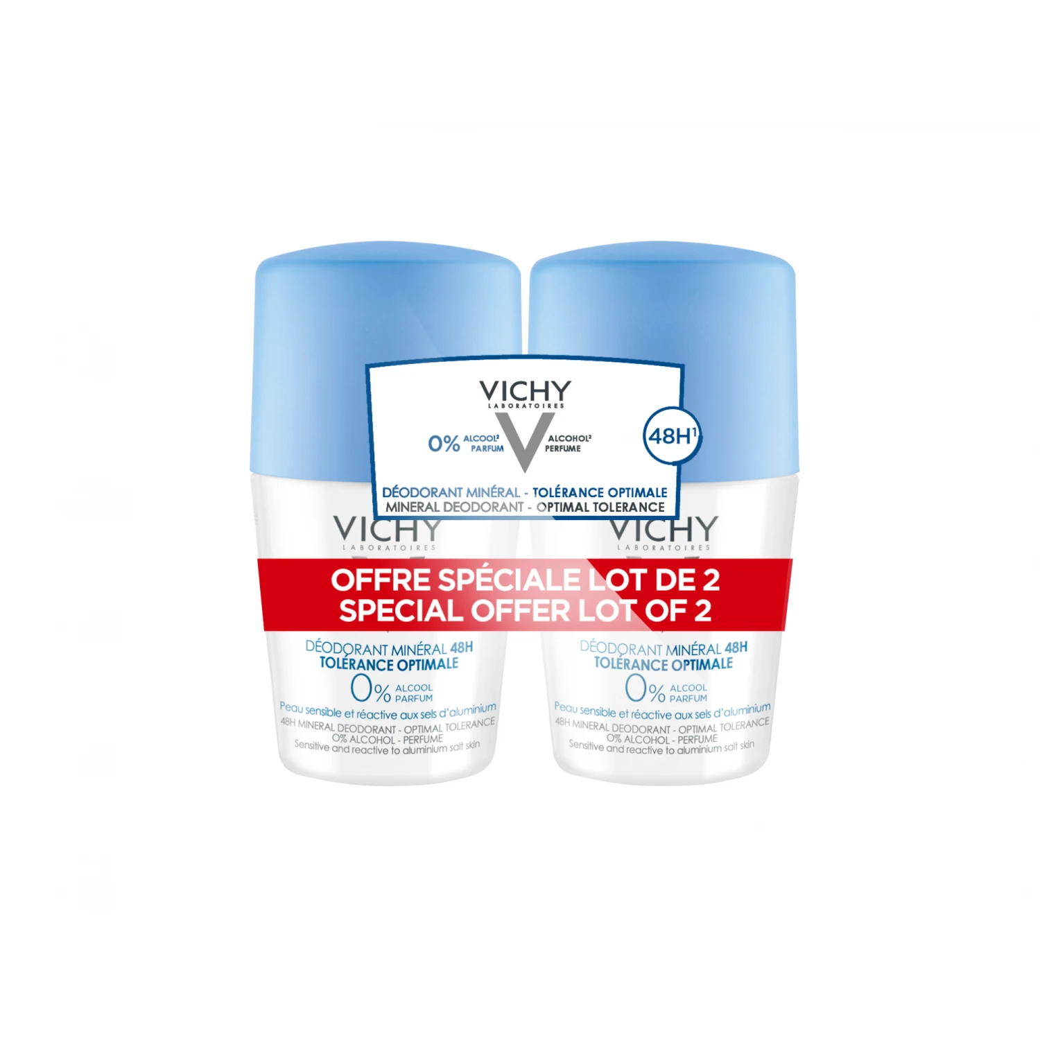 Vichy Déodorant Minéral 48H Tolérance Optimale Roll-On Lot de 2 x 50 ml est un déodorant pour la peau sensible et réactive aux sels d’aluminium.